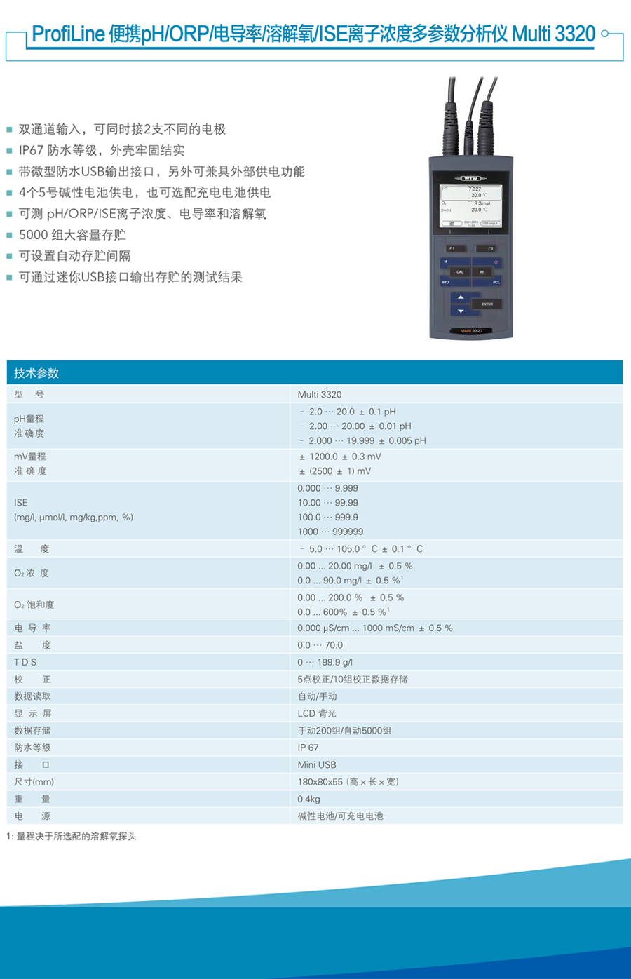 Multi 3320手持式多參數(shù)測(cè)試儀,測(cè)量PH、ORP、ISE、電導(dǎo)率、溶解氧及溫度,可連接各種模擬的標(biāo)準(zhǔn)PH復(fù)合電極或ORP電極、電導(dǎo)率電極、離子電極和溶解氧電極,LCD背光顯示,可同時(shí)檢測(cè)PH值、ORP值、電導(dǎo)率值、溶解氧值、溫度值等多種參數(shù)。