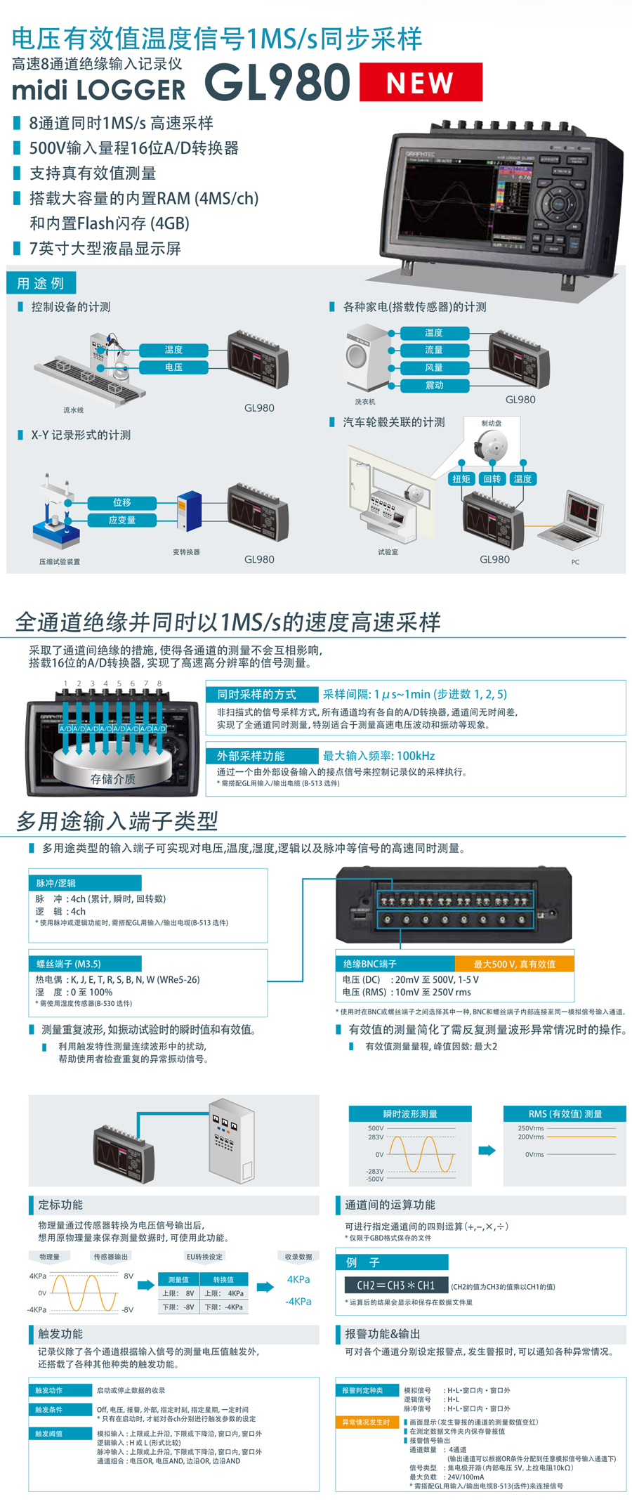 產(chǎn)品描述:日本圖技GL980多通道數(shù)據(jù)記錄儀,原GL900-8記錄儀的升級(jí)產(chǎn)品,8通道絕緣輸入記錄新型號(hào)GL980可實(shí)現(xiàn)高速 1MS/s 的同步采樣,可以高效測(cè)量電壓、電流、溫度、壓力、流量和邏輯信號(hào)。GL980有強(qiáng)大的存儲(chǔ)空間,機(jī)器內(nèi)置4G內(nèi)存,還可以外接SD卡,記錄時(shí)間長(zhǎng)存一年以上........