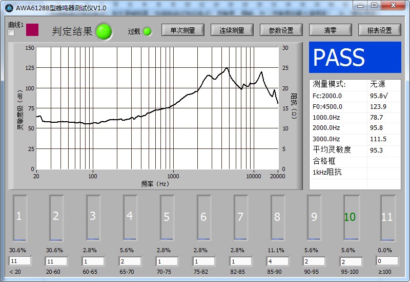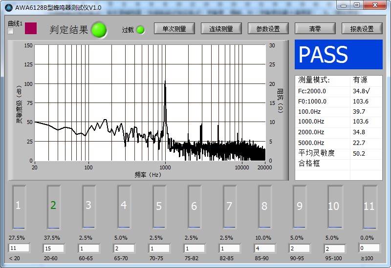 蜂鳴器測試儀是專用于蜂鳴器電聲特性測試的儀器。測試儀可以測試包括有源(包括電磁式和壓電式)和無源(包括電磁式和壓電式)兩種類型的蜂鳴器電聲指標(biāo)。有源蜂鳴器通過輸入蜂鳴器的直流電壓,并選擇輸出方式,在主界面上會顯示在一段頻率范圍內(nèi)的頻譜曲線,同時在右邊的結(jié)果顯示框中顯示最高點的頻率及靈敏度級,蜂鳴器出廠的額定頻率及對應(yīng)的靈敏度級(頻率可以在參數(shù)設(shè)置界面自行輸入)。無源蜂鳴器通過輸入信號幅度,并可以自定義輸出的頻率范圍,在所定義的頻率范圍內(nèi)輸出頻響曲線。同時可以顯示平均靈敏度,諧波失真,阻抗及曲線最高點的頻率及相對應(yīng)的靈敏度級,同時還可以顯示出廠額定頻率及對應(yīng)的靈敏度級。測試結(jié)束后,根據(jù)自定義的標(biāo)準(zhǔn),簡潔直觀的顯示 PASS/FAIL,自動判斷是否合格??梢院妥詣臃诌x機臺配合使用,自動判斷是否合格,進行產(chǎn)品分檔,極大的提高了測試效率。