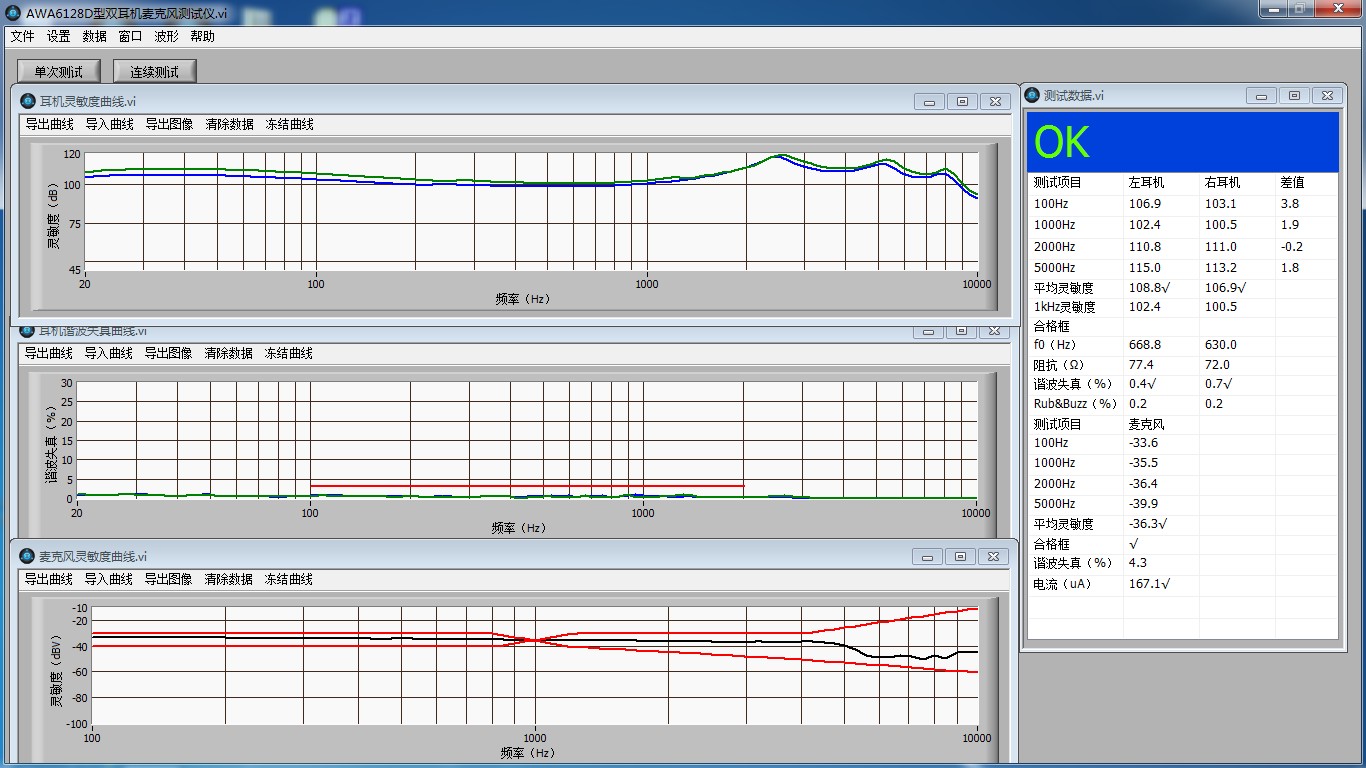 該儀器由電聲測試儀(4通道)主機、耳模擬器或聲耦合腔、仿真口、聲控測試傳聲器、測試架和專用的分析軟件組成。能同時快速準(zhǔn)確地測量雙耳機的靈敏度及差值、頻響曲線、阻抗、諧波失真、極性和麥克風(fēng)的靈敏度、頻響曲線、電流和特性電壓等電聲性能。根據(jù)設(shè)定的門限自動判斷耳機和麥克風(fēng)合格品或不合格品。測試結(jié)束后,簡潔直觀的顯示出 OK/NG,極大的提高了測試效率。