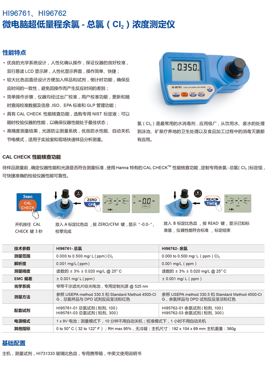 測(cè)量范圍:0.000 to 0.500 mg/L(ppm)CI2