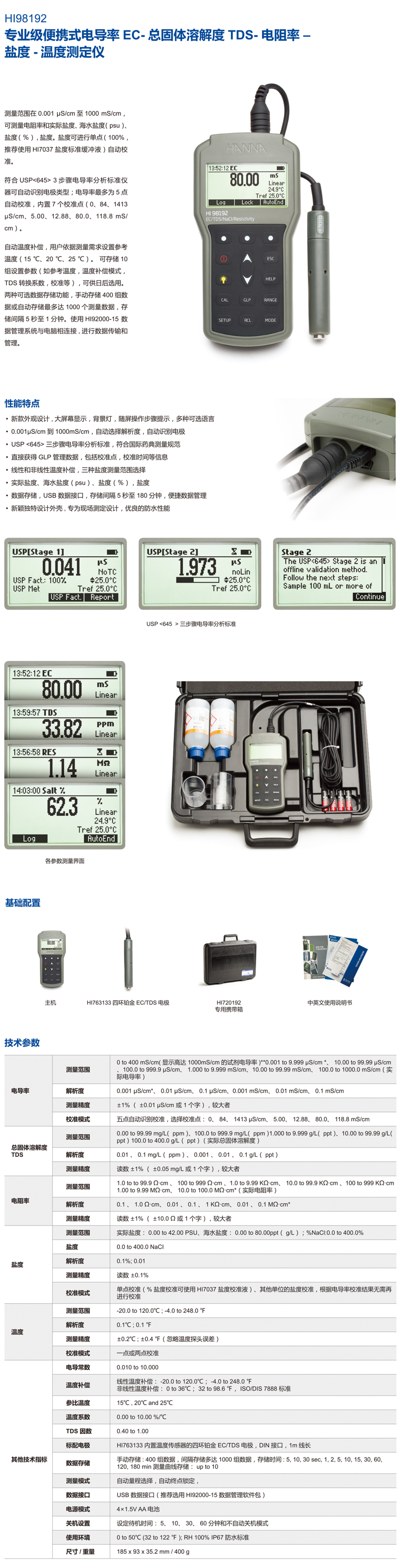 產(chǎn)品描述:高精度EC-TDS-NaCI-°C/oF/K測定儀,大LCD顯示屏,電導(dǎo)率EC-電阻率-總?cè)芙夤腆wTDS-實際鹽度(PSU)-海水鹽度-鹽度(NaCI%)-溫度等常規(guī)重要水質(zhì)指標(biāo)快速精確測量,自動識別量程范圍及單位轉(zhuǎn)換;新款外觀設(shè)計,隨屏校準(zhǔn)操作步驟提示,USP (645) 符合國際藥典測量規(guī)范........