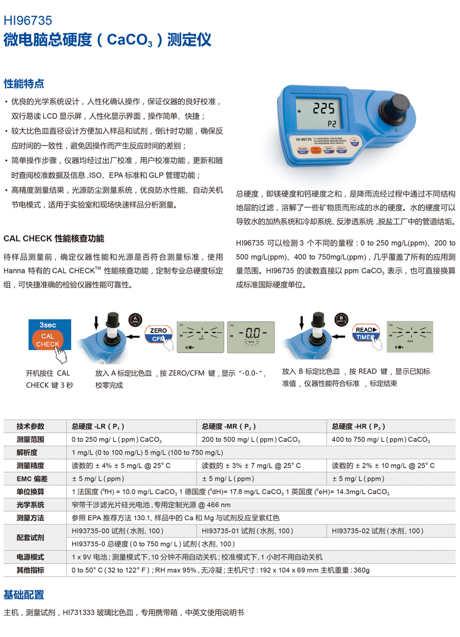 測量范圍:LR:0 to 250 mg/L(ppm)CaCO3 ;