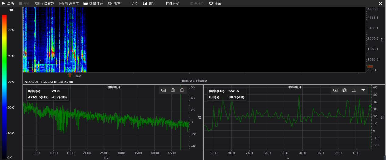 2、用于故障特征點(diǎn)分析診斷用,橫坐標(biāo)為時(shí)間,縱坐標(biāo)頻率,分貝大小用顏色表示;